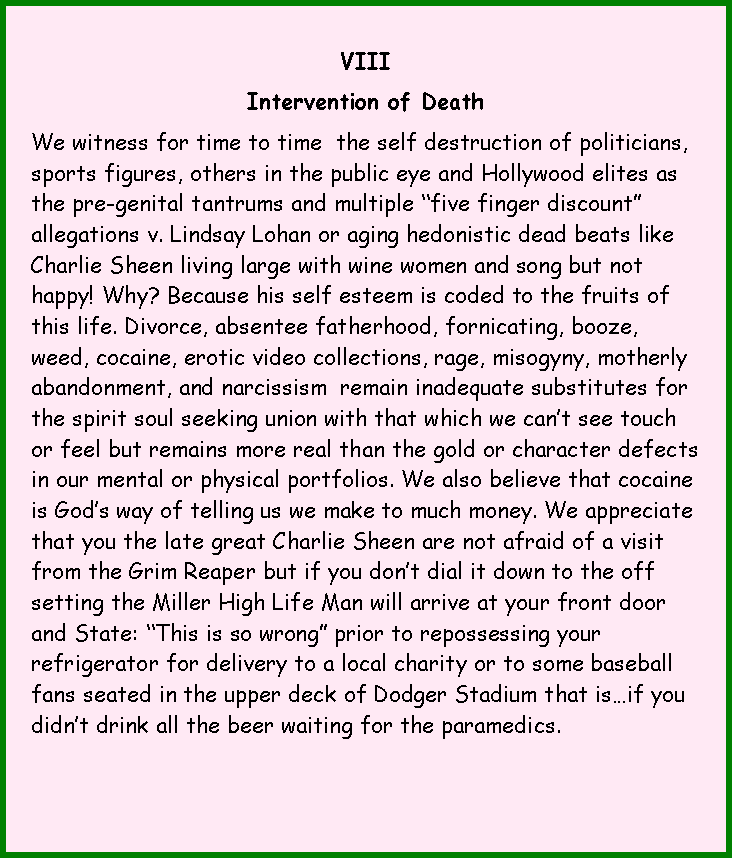 VII Responsorial We have witnessed the ruthless attacks by anonymous posters against persons who are different from them or remain easy targets due to their innocence, naiveté, blind faith, unconditional trust of their fellow man. Cyber bullying remains a problem but has subsided sharply due to new stalking and harassment laws and aggressive enforcement by local, state and federal authorities. For that we thank them. To the perpetrators we are saddened you choose to waste any precious moment in life living vicariously through others rather than challenging us with meaningful dialogue and legitimate criticism which requires more than double thumb dexterity like research, time and thought; Lord have mercy! |